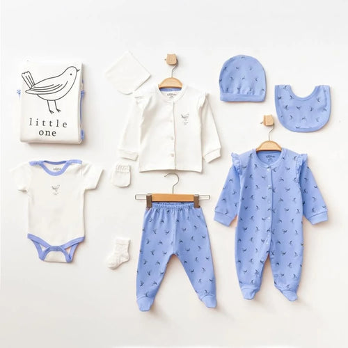 1 Long Sleeve Onesie 1 Footed Pants with Booties 1 Bodysuit 1 Blanket 1 Burp Cloth 1 Pair of Mittens 1 Bib 1 Hat 1 Pair...